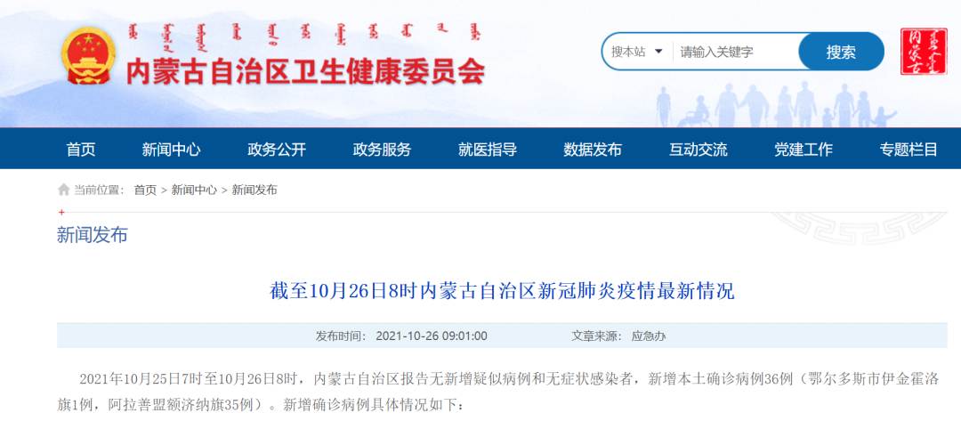 內(nèi)蒙古衛(wèi)健委通報(bào),2021年10月25日7時(shí)至10月26日8時(shí),內(nèi)蒙古自治區(qū)報(bào)告無(wú)新增疑似病例和無(wú)癥狀感染者,新增本土確診病例36例(鄂爾多斯市伊金霍洛旗1例,阿拉善盟額濟(jì)納旗35例)。