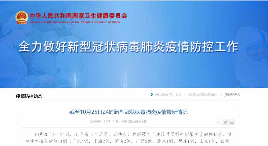 據(jù)國(guó)家衛(wèi)健委消息,10月25日0—24時(shí),31個(gè)?。ㄗ灾螀^(qū)、直轄市)和新疆生產(chǎn)建設(shè)兵團(tuán)報(bào)告新增確診病例43例。