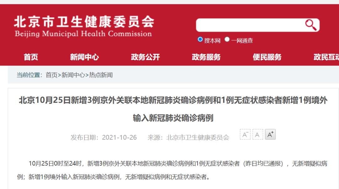 10月25日0時(shí)至24時(shí),新增3例京外關(guān)聯(lián)本地新冠肺炎確診病例和1例無(wú)癥狀感染者,無(wú)新增疑似病例;新增1例境外輸入新冠肺炎確診病例,無(wú)新增疑似病例和無(wú)癥狀感染者。