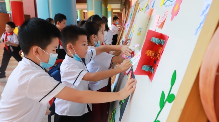 清晨,學生們帶著親手制作的節(jié)日賀卡來到學校,用心地貼在節(jié)日祝福板上,隨后,少先隊員代表向全體教師送上鮮花。一張張精美的卡片,一句句真切的話語,一束束美麗的鮮花,表達了學生對老師的感恩與祝福。
