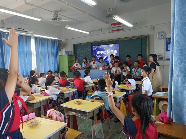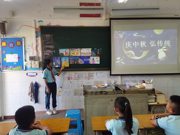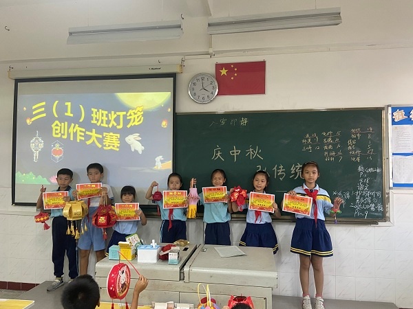 9月18日,為了讓學(xué)生更深入了解中秋節(jié)文化,少先隊(duì)大隊(duì)輔導(dǎo)員朱文娟老師在國旗下深情地講述關(guān)于中秋節(jié)的來歷,與學(xué)生們一起吟詠文人墨客的經(jīng)典詩文,呼吁大家繼承祖國優(yōu)秀傳統(tǒng)文化和傳統(tǒng)節(jié)日,增強(qiáng)民族文化自信心。班會課上,班主任有條不紊地開展活動。如一、二年級的小朋友,在爸爸媽媽的幫助下帶上月餅、水果等美食,與同學(xué)們開展中秋傳統(tǒng)美食交流會。三、四年級開展一次中秋創(chuàng)意燈籠展示會。會上,學(xué)生提著親手制作的燈籠得意地分享他們的制作樂趣。